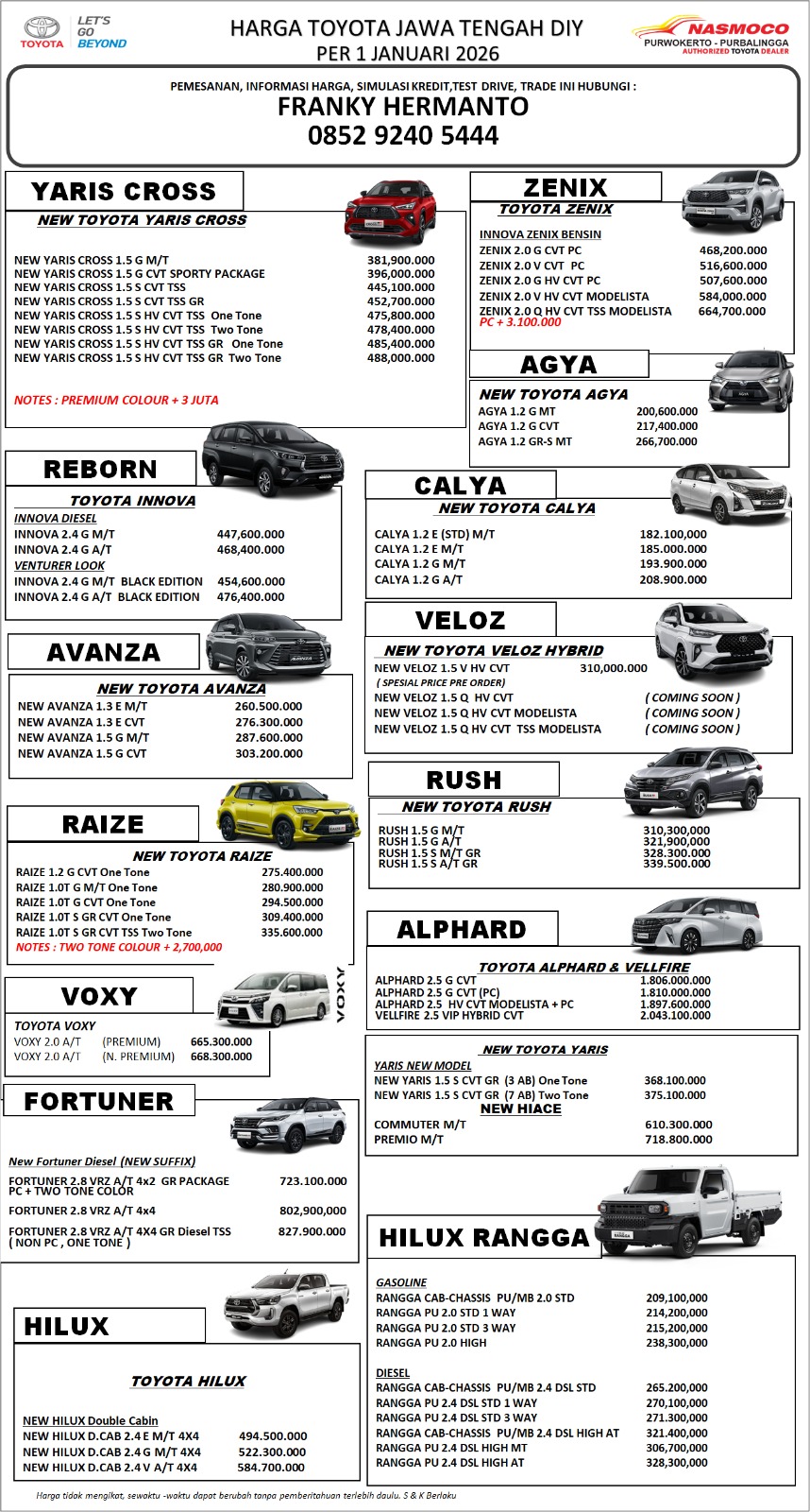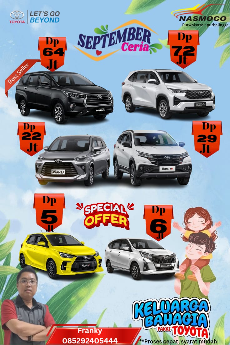 Perkenalkan Saya Franky Hermanto, ST, Sales Executive Di Dealer Toyota Nasmoco Purwokerto Menawarkan Pelayanan Pembelian Cash/Kredit Dengan DP Ringan, Angsuran Ringan, Serta Kualitas Pelayanan Terbaik. Mau Pesan Mobil Toyota Di Authorized Dealer Resmi Toyota Nasmoco Purwokerto :